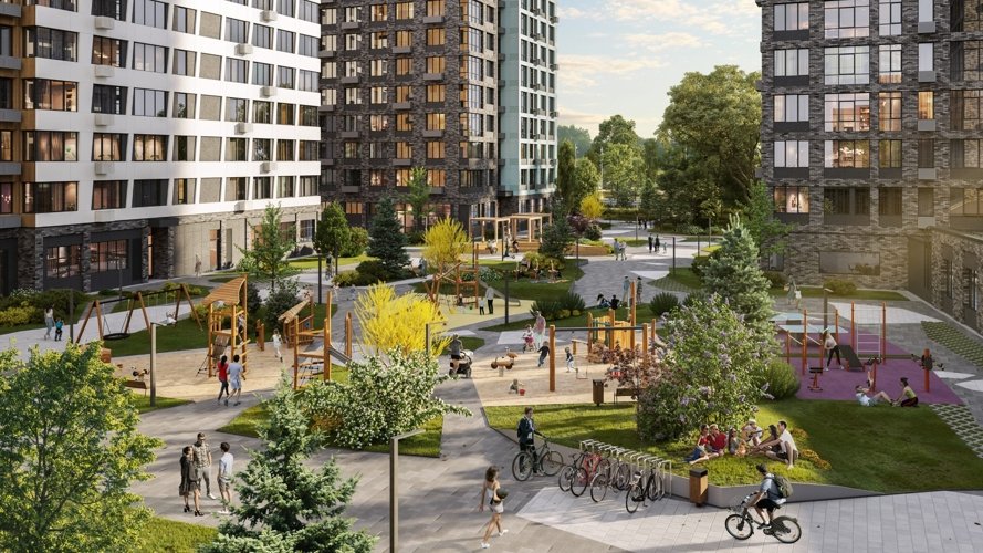 круглосуточное видеонаблюдение и охрана. Безбарьерная среда, детские и спортивные площадки, велодорожки и зоны отдыха.